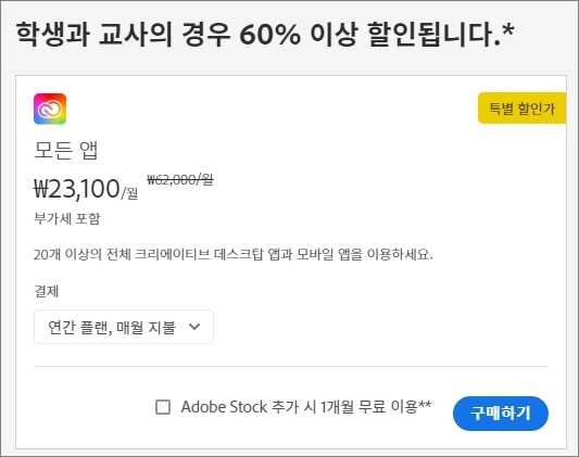 만약에 어도비 제공하는 포토샵(Photoshop), 일러스트레이터(Illustrator), 라이트룸(Lightroom), 프리미어프로(Premiere Pro), 인디자인(InDesign) 외에도 몇 가지 이상의 앱을 여러 가지로 동시에 활용하는 학생인 경우에는 월 6만 2천 원 상당의 크리에이티브 클라우드 모든 앱을 60% 할인 받을 수 있습니다.
