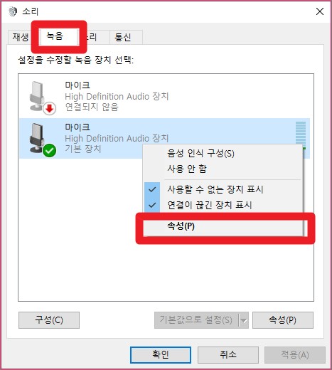 - 상단의 메뉴에서 녹음을 선택하신 후, 활성화된 마이크 장치에서 마우스 우클릭을 하신 후 ‘속성’을 선택하시면 됩니다.