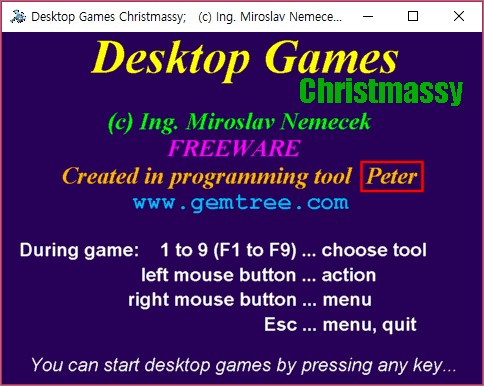 • 마우스를 클릭하면 게임이 시작되며 F1 ~ F9키를 눌러 도구를 바꿀 수 있습니다.