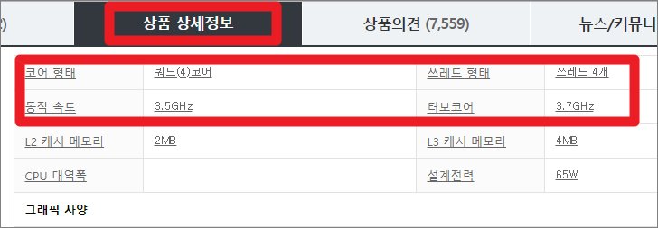 - 상품 상세 정보 페이지에 접속하시면 아래의 사진처럼 코어 형태, 쓰레드 형태, 동작 속도, 터보코어 항목을 확인하실 수 있는데요.