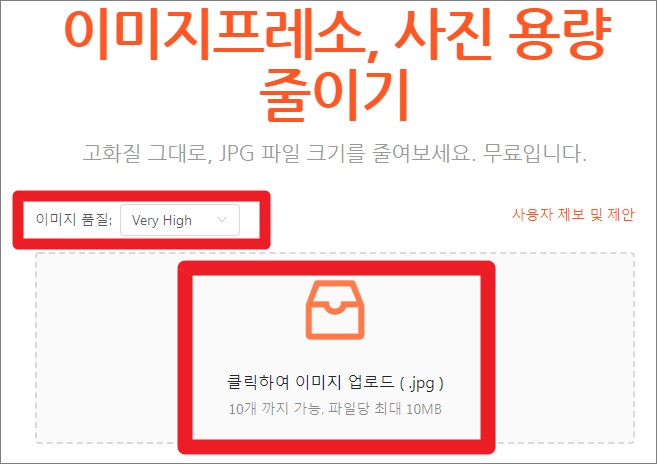 - 화면 중앙의 업로드 버튼을 클릭하여 jpg 용량 줄이기 작업에 사용할 이미지 파일을 불러오기 합니다.
