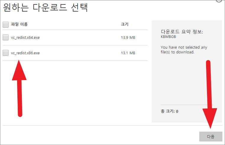 - 현재 사용중인 윈도우의 버전에 따라 x64 또는 x86 버전 중 1가지를 선택하시면 되고, 우측 하단의 다음 버튼을 클릭하시면 됩니다.